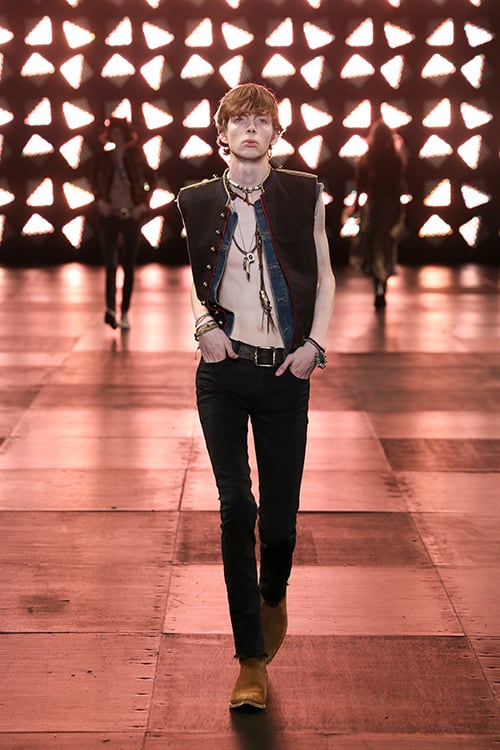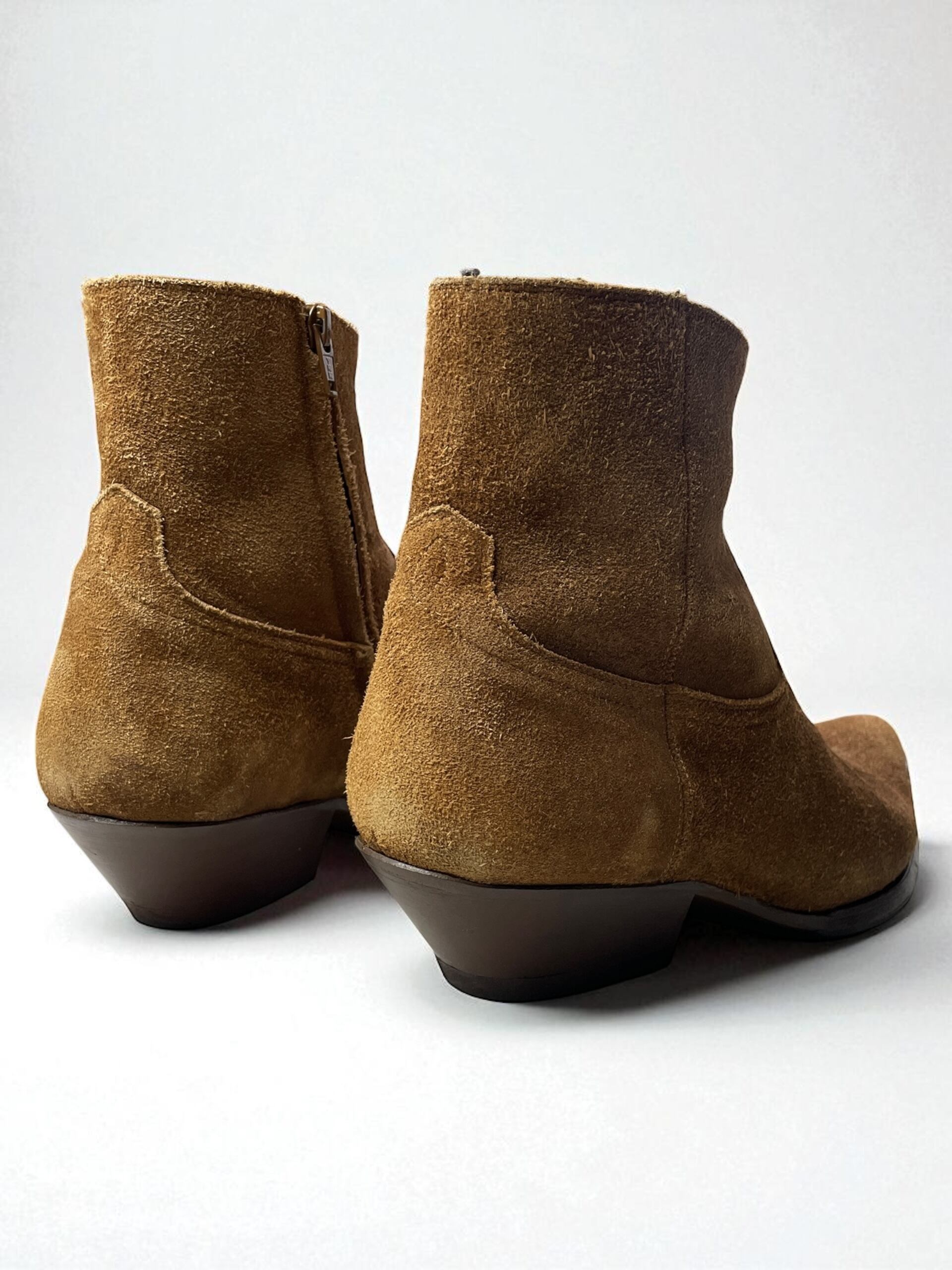 エディ・スリマンによるSAINT LAURENT PARIS 2015年春夏コレクションから登場したこちらのスエードブーツは、彼のロックなテーラリングとウェスタンの影響を象徴する一足です。柔らかなブラウンスエードで仕立てられ、シャープなポインテッドトゥ、傾斜したキューバンヒール、そして機能的なサイドジップを備えています。ランウェイでも大きく取り上げられ、そのシーズンを代表するシルエットとなりました。